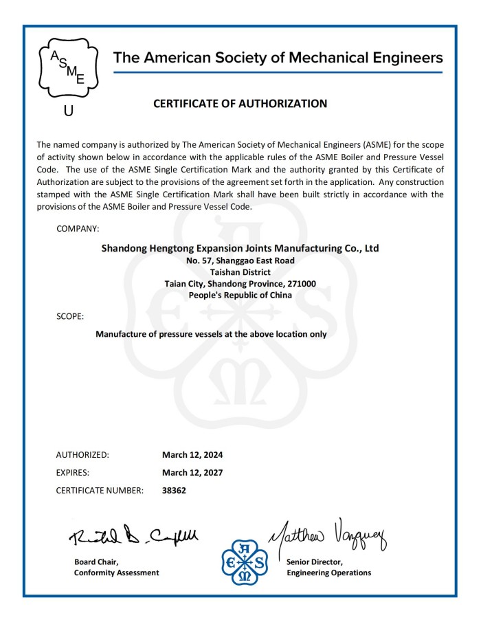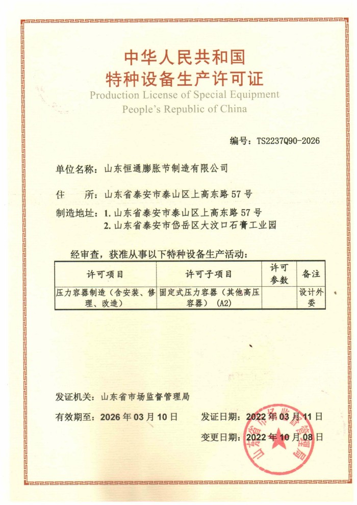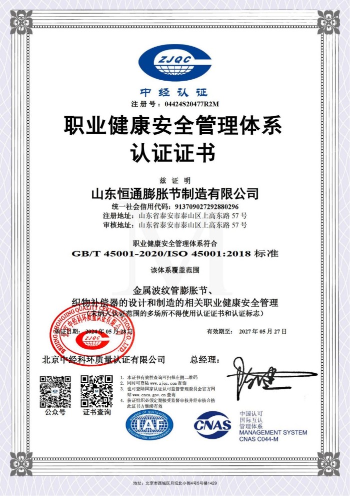 公司取得我國特種設(shè)備制造許可證、壓力容器A1級資質(zhì)、壓力管道元件A、B的資質(zhì),并且獲得了歐盟PED-CE認(rèn)證、美國ASME“U”鋼印、ISO 9000質(zhì)量管理體系認(rèn)證、GB/T 14000 環(huán)境管理體系認(rèn)證及GB/T 45000 職業(yè)健康安全體系認(rèn)證。膨脹節(jié)產(chǎn)品涵蓋壓力管道波紋膨脹節(jié)、壓力容器波形膨脹節(jié)、金屬波紋管、金屬軟管、聚四氟補(bǔ)償器、橡膠補(bǔ)償器及非金屬補(bǔ)償器等。